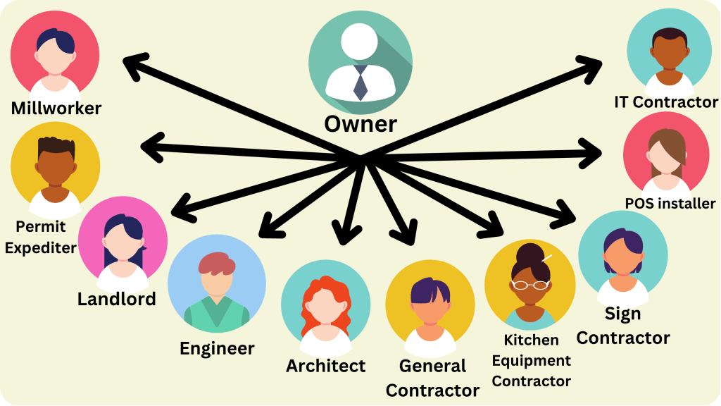 While this seems like more than enough of a task in itself, unfortunately there are a lot more people involved in the construction of a new location. The architects will need engineers to design the plumbing, mechanical, and electrical systems. The general contractor leaves some elements up to you (such as kitchen equipment, mill work, IT, and signage) because of how specific the needs of each brand (and each store) can be. A permit expediter, an expert on the ins-and-outs of the permit process, will lower the risk of stopping a project before it even gets started. As you can imagine, this list goes on. In reality, the organization chart typically looks something like this: